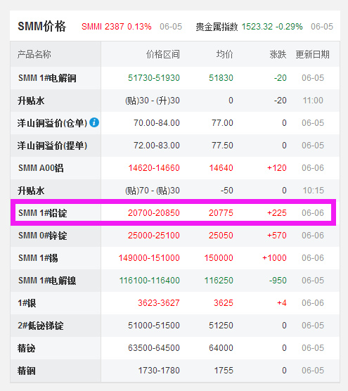 6月6日 鉛價再次上漲225元